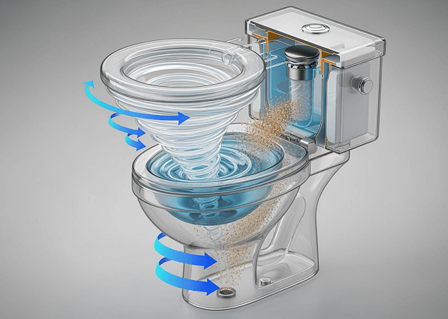 Once the flow reaches the outlet, the burst of water (now carrying the waste) moves through the trapway and into the drain. The bowl empties efficiently because the swirl concentrates the cleaning and transport energy.