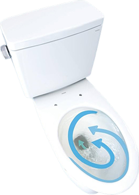 The fast-moving rotating water creates strong shear forces against the ceramic surface. That shearing dislodges residue and loosens stains across the full 360° of the bowl as the water sweeps every area.